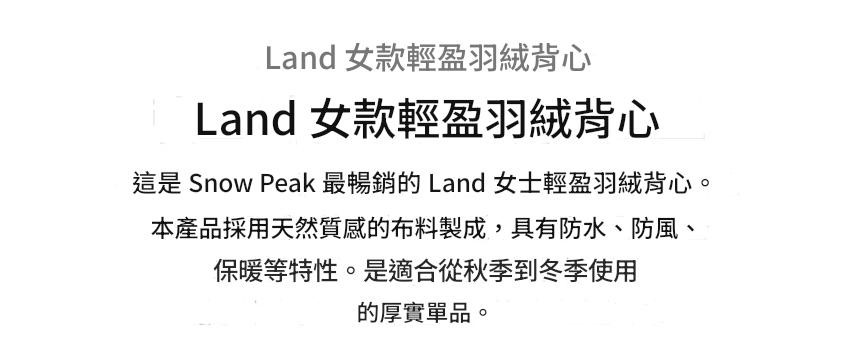首頁 > 戶外裝備shop > 【Snow Peak】女款 Land 輕量羽絨背心