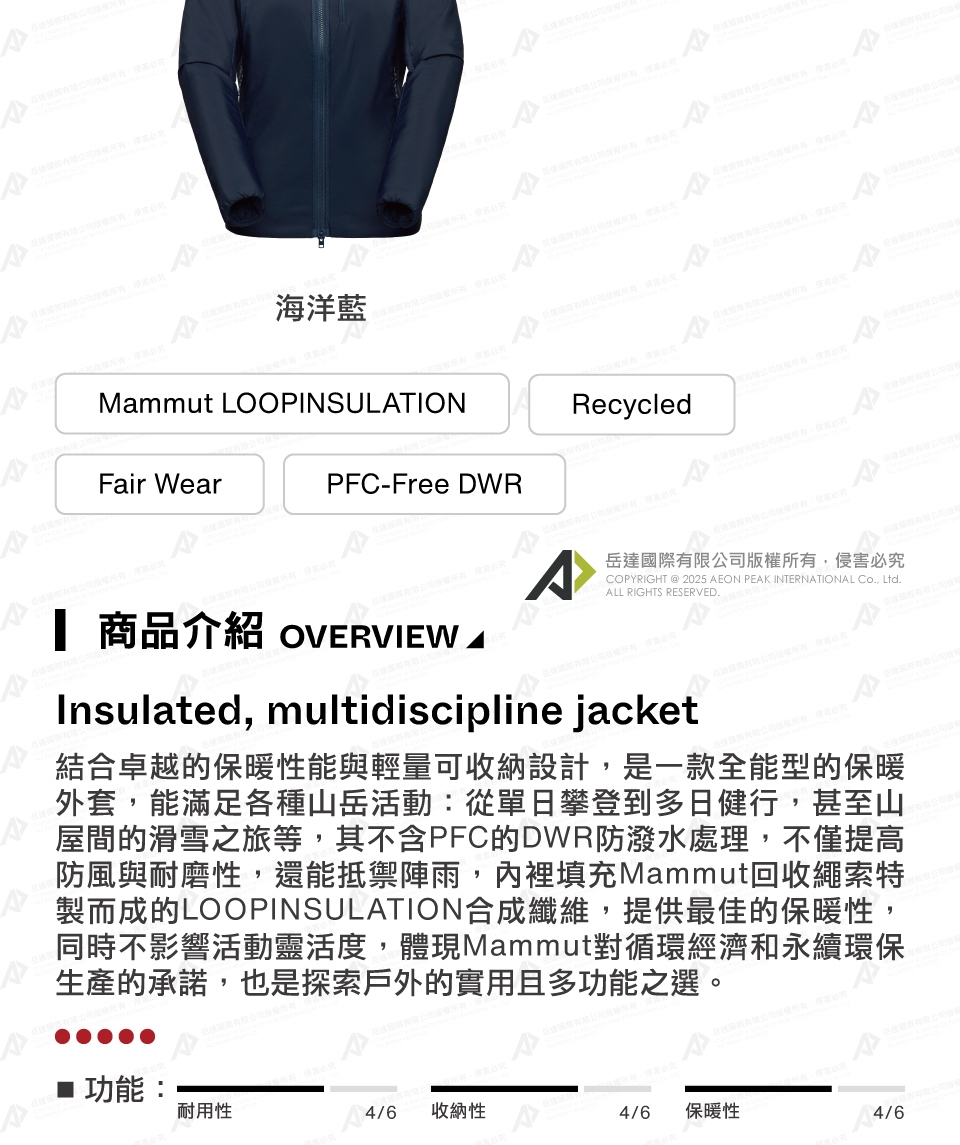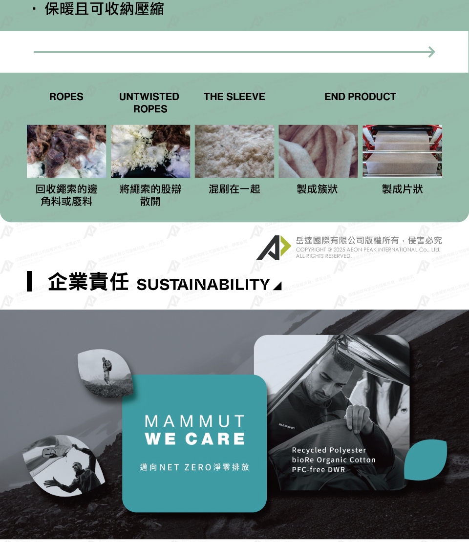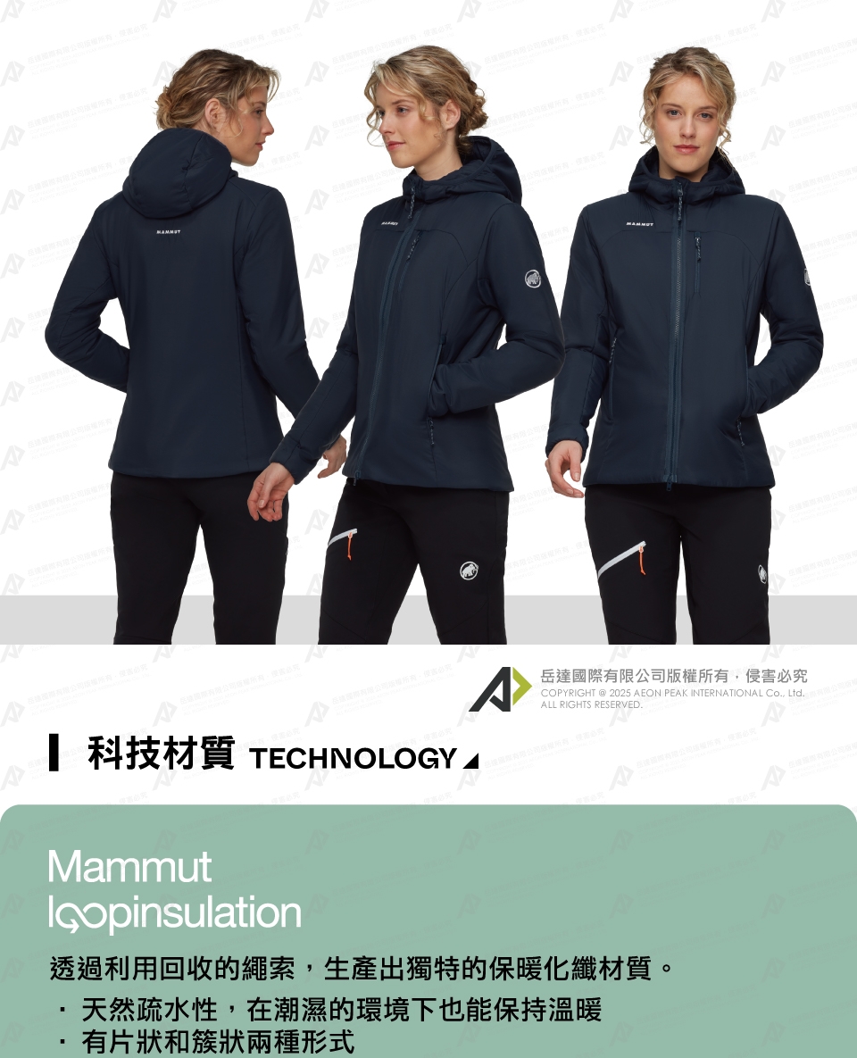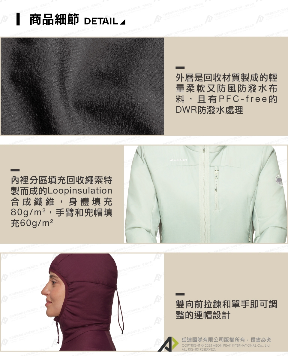 -分區 Mammut LOOPINSULATION 保暖設計(主體 80g/m²,手臂與帽兜 60g/m²)