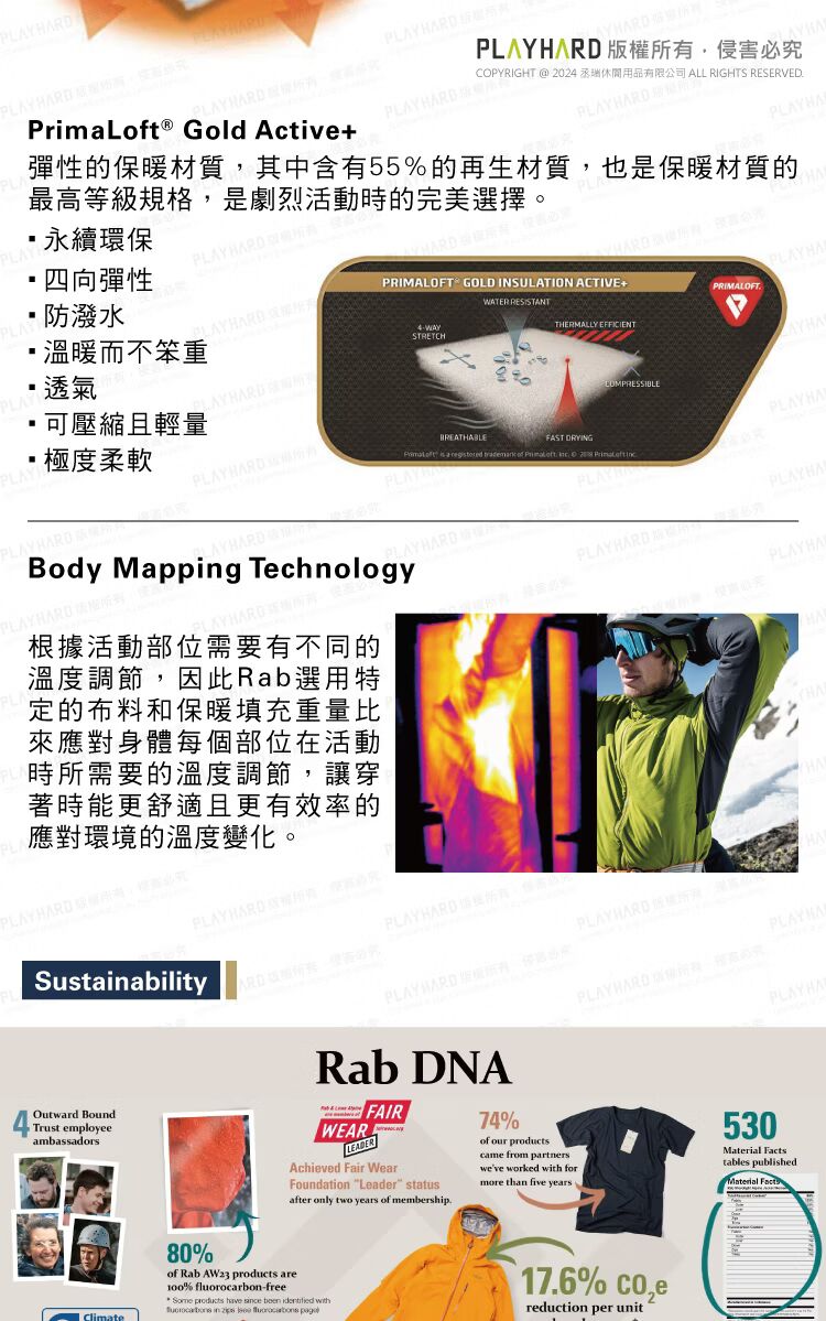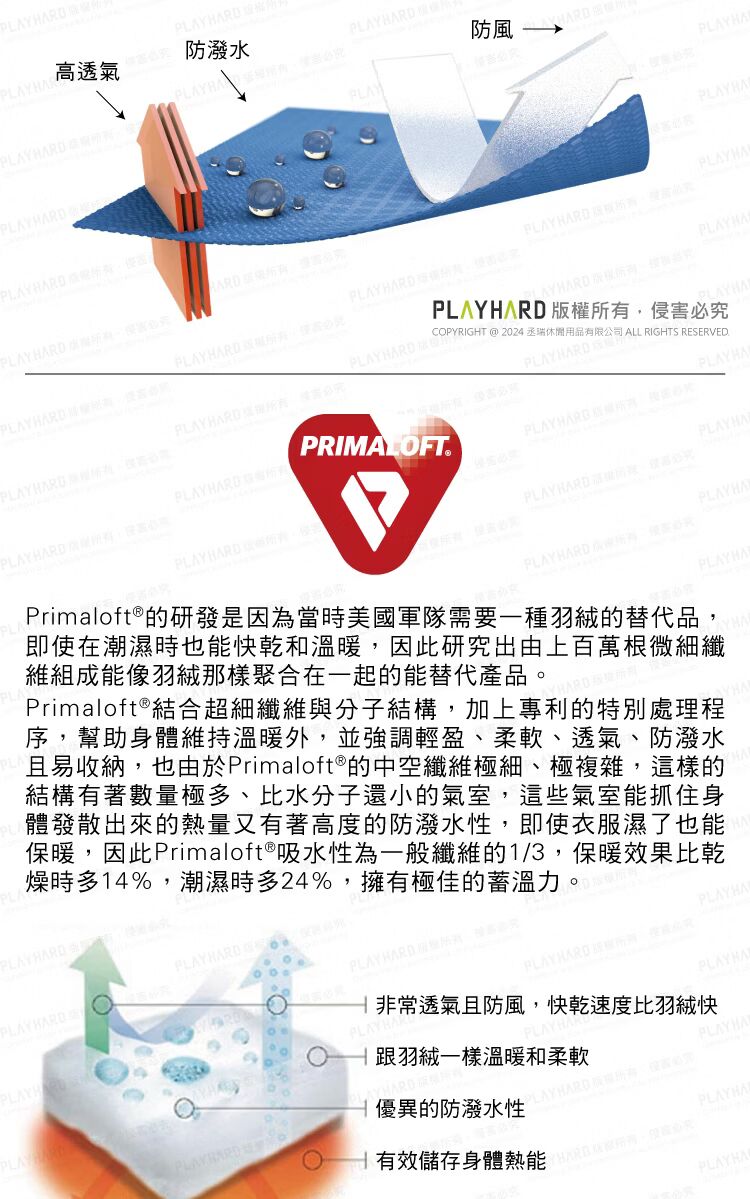 隔層:前、後、袖子頂部和衣領採用 60gsm PrimaLoft® Gold Active+ 隔熱材料(55% 再生材料)