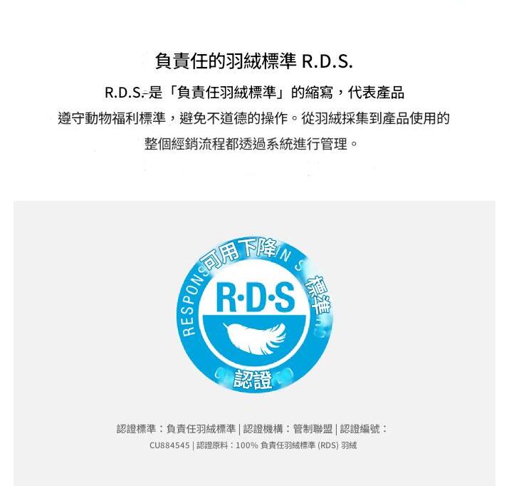 -雙鴨絨:採用麝香羽絨製成,比普通鴨絨更長、更豐富,保暖性極佳,且具有超過 700 的高蓬鬆度