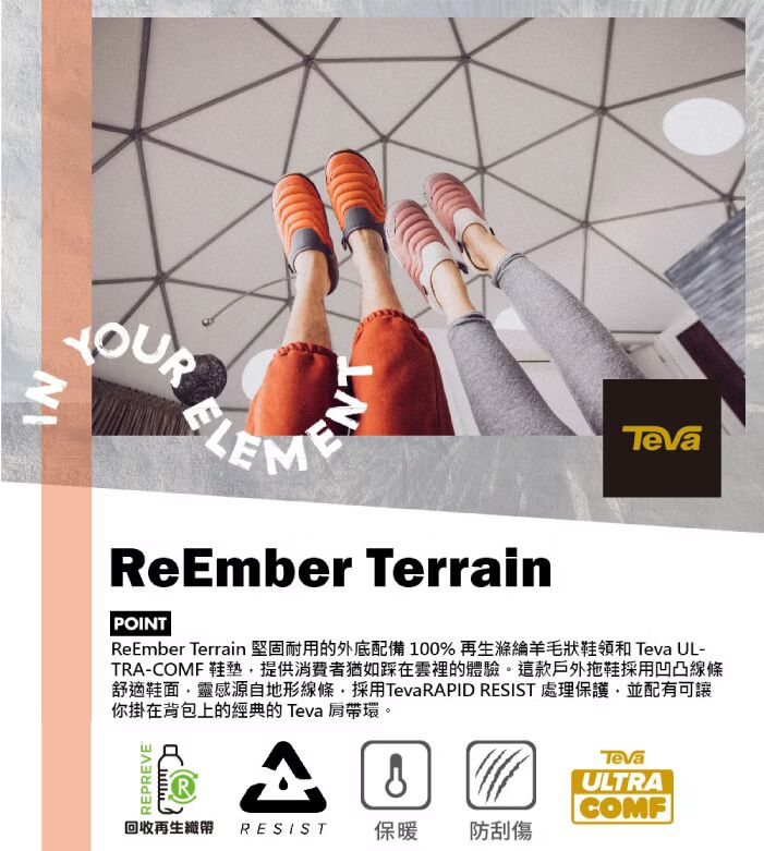 -為冒險而生的鞋款,抗水100%再生防撕裂鞋面靈感來自經 Teva RAPID RESIST保護塗層處理的經典戶外裝備,使水滴不會停留在鞋面上