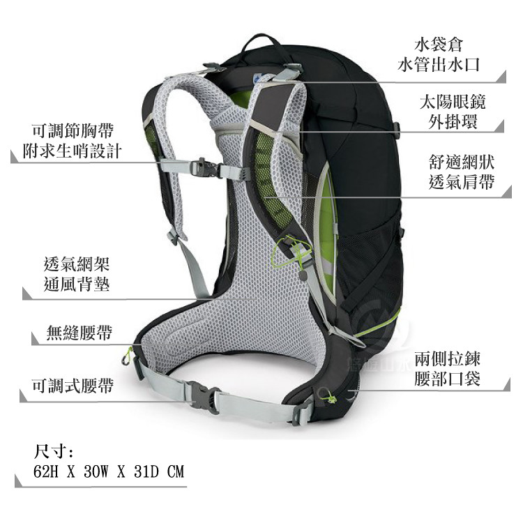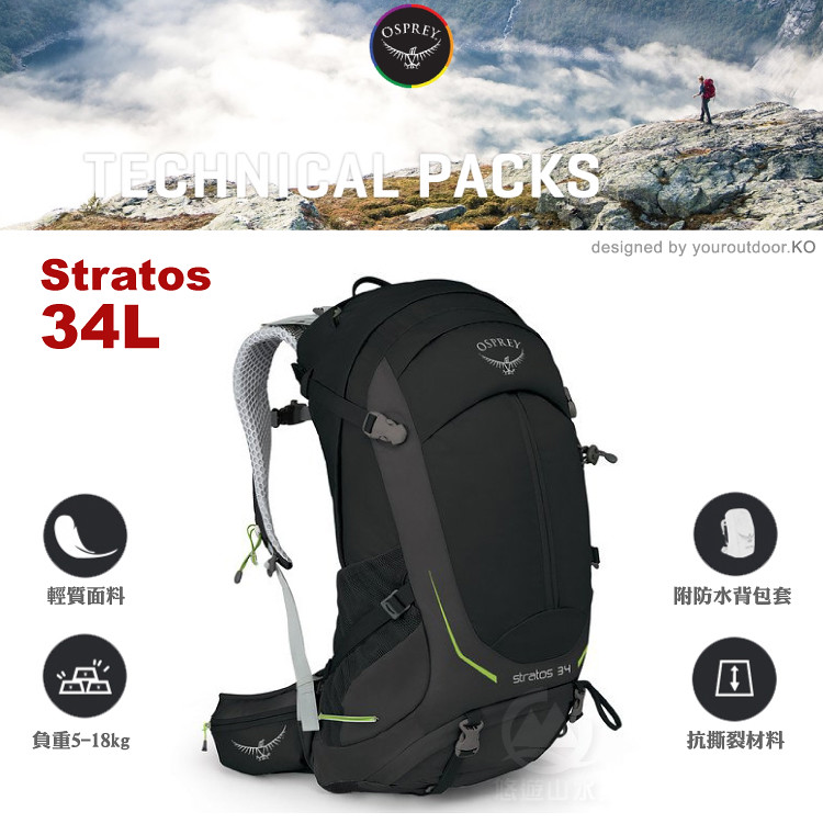 • 【Osprey】6折出清!! 男款 Stratos 34L 透氣網背登山背包-黑 S/M