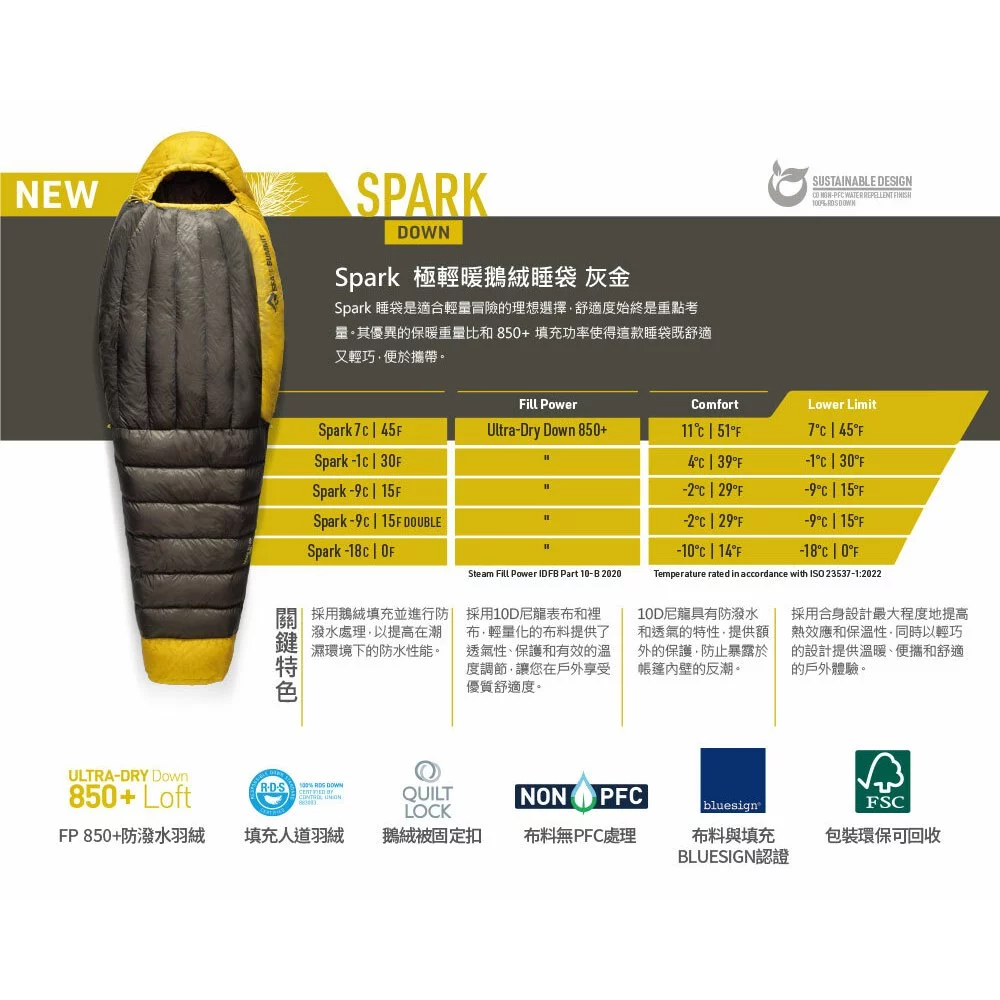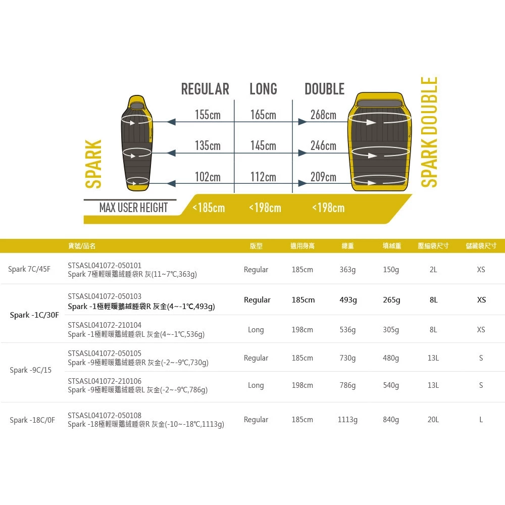 睡袋結合:Spark 7 & -1 無法與其他睡袋搭配、Spark -9 & -18 可以與Sea to Summit女款睡袋配對使用